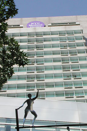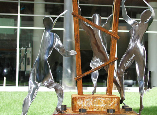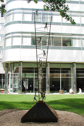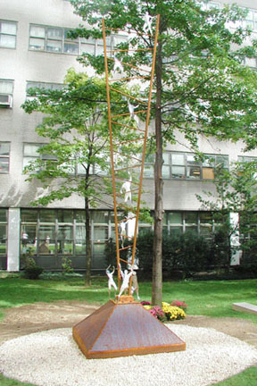 chosen for this important event. We thank everyone at NYU Medical Center for their enthusiastic support. Thanks also to Marco Martelli Associates for an excellent job installing "Essence". Standing 18 feet and weighing over 1,400 lbs, "Essence" was created using Cor-Ten steel for the base and ladder. The figures were cold forged by hand from solid 316L Stainless Steel. Below are some photos of "Essence"