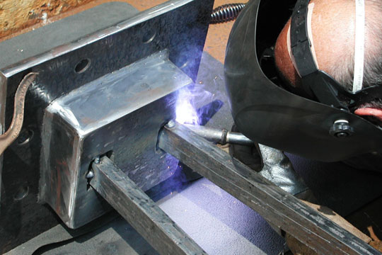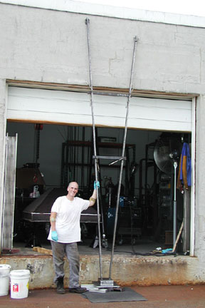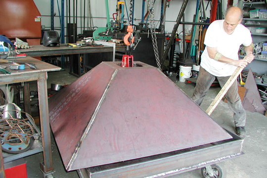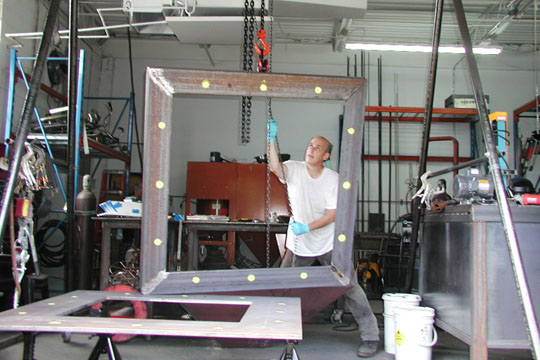 Hoisting the 350 pound angle iron frame of "Essence" during fabrication.