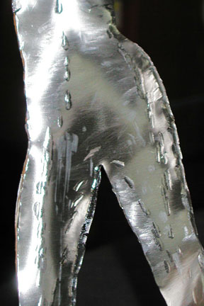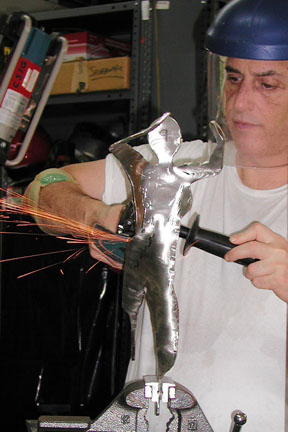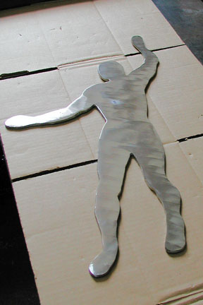 The figures are plasma torch cut by hand from 1/4'' stainless steel plate. Each figure is then cold forged by hand resulting in considerable dents, gouges, and scratches which all have to be carefully disc ground and polished out. This explains the "Tendonitus" I have developed in both arms. Hey, no pain no gain !!