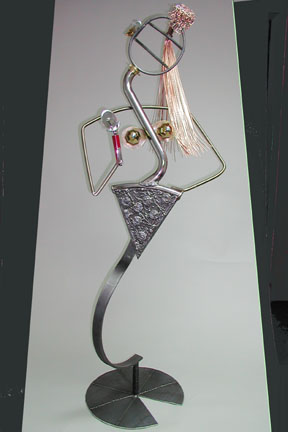 | Dominique Inspired by a statuesque server where we recently enjoyed a wonderfull pizza. Dominique is the second creation in my new whimsical "Slice" series. Her sister is currently on display in our dining room. Sherril and I fell in love and could not part with her... Her hair is hand formed from individual strands of copper clad welding rod. She is holding a pizza cutter and is mounted on a steel pizza with a slice missing. Dominique has big time attitude and will bring a smile to your face ! SOLD Copyright 2004 Craig Brown |