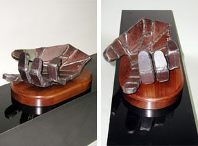 | Hand Every sculpture and functional art piece on this website has been made by hand, one at a time. A very good friend suggested I create a solid steel hand to symbolize the "one of a kind, hand made" credo of Craig Sherril Studio. This welded hand is formed from 3/4" steel plate. Each segment is plasma cut , deburred, and carefully welded by hand. While welding , this sculpture gets so hot that I have to wear special heat reflective gloves to avoid cooking my own hands ! (I found out the hard way on the first hand I welded....) The first 3 hands sold quickly, Number 4 is mounted on the solid Walnut base in a "palm up" position. Number 5 is mounted upright. Each is hand signed. Series of 5 is sold out Copyright 2003 Craig Brown |