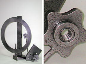 | Jardiniere is a "found object" creation. In this case the objects were not found, they were generously donated by kind friends. The heavy angular pieces in the base were originally part of a bridge. Friends own a machine shop, and these pieces were headed for the scrap pile. They offered them to us, and we are glad they did. The cast iron "flowers" were also donated by friends. They were the spin on locks for a weight lifting bar. They were no longer "pumping iron" and asked if we had use for them. We were not sure at the time, but as we love "found objects" we graciously accepted them. The ring and the upright was given to us by Mel, who is my mentor and a wonderful sculpter. We have a studio full of "found objects", and when they "speak" to us, a creation is born. |