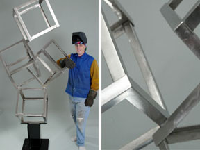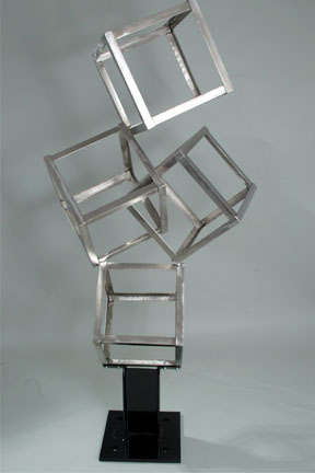 heat treated Stainless Steel for strength. After the 4 cubes were built, we concentrated on the base. The bottom plate is 1 inch thick solid steel. We chose this for stability. We then designed the I-Beam section to securely cradle the first cube. The fun part was assembling the 4 cubes on top of the base. Each had to be perfectly balanced, and still be visually interesting. The center cubes interlock and the top cube appears to be floating. Life Needs Balance is a very special sculpture and has a lot of our blood, sweat, and tears in it. |