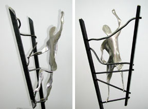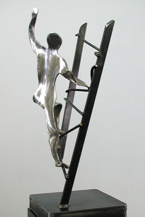 | Time Traveler Many of us have thought about the possiblity of traveling through time. Would you go forward or back? My latest ladder sculpture features a hand forged stainless steel figure reaching into a time warp. The rungs become fluid as you enter.... "Time Traveler" is the first in a series of table top ladder sculptures. Ladder sculptures can be created in sizes from 2 ft to 25 ft or taller. With one figure, or as many as desired. "Essence" is almost 20 ft tall and incorporates 9 figures. It is installed at NYU Medical Center in NYC. Please click the link on the lower left of our Home Page to view "Essence" SOLD Copyright 2004 Craig Brown |