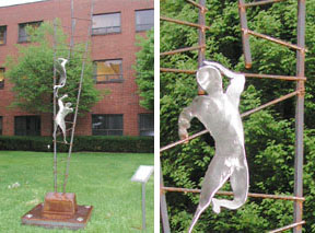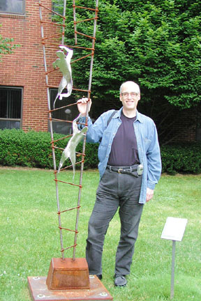 | Choices We exhibit each year at the outdoor sculpture show at Mather Hospital in Port Jefferson on Long Island N.Y. Our entry for 2004 was "Choices". We continue to develop the "Ladder" series of sculptures. "Choices" is our first ladder that morphs into two. The geometric form on the base represents home. Growing up many of our choices are made there by our parents. When we leave home and begin lifes journey we are forced to make our own choices. One small choice can effect the entire balance of our life. We know deep down inside which choice to make. The challenge is finding the will power to proceed..... Copyright 2004 Craig Brown Sold |