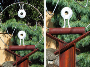 | Yin Yang 3 After creating Yin Yang 1 & 2 in traditional style, It was time to experiment with abstraction. Rules were broken, an unusual and captivating sculpture was born. The solid stainless steel bar that divides the circle has been attached in a fashion that allows kinetic movement. Rain water flows down both sides of the steel angles which reinforce the ancient philosophy of Yin Yang. The natural rust patina will change over the years, just like in Yin Yang, nothing stays the same..... Copyright 2003 Craig Brown SOLD |