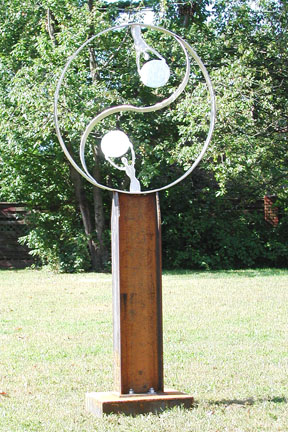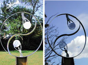 | Yin Yang 5 The male and female figures holding the "world" are hand cut from 1/2'' thick solid marine grade stainless steel. The outer ring and Yin Yang divider are hand formed from 3/8" thick stainless as well. Each figure is then carefully deburred and polished before being seamlessly "TIG" welded into place. This sculpture creates a wonderful shadow in the sunlight, and has an iridescent glow in the moon light. Copyright 2003 Craig Brown SOLD |