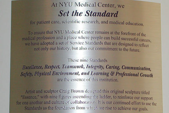In Tisch Hospitals waiting room overlooking the court yard where "Essence" is installed the above plaque explains NYU Medical Centers Service Standards.