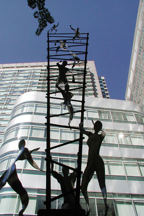 chosen for this important event. We thank everyone at NYU Medical Center for their enthusiastic support. Thanks also to Marco Martelli Associates for an excellent job installing "Essence". Standing 18 feet and weighing over 1,400 lbs, "Essence" was created using Cor-Ten steel for the base and ladder. The figures were cold forged by hand from solid 316L Stainless Steel. Below are some photos of "Essence"