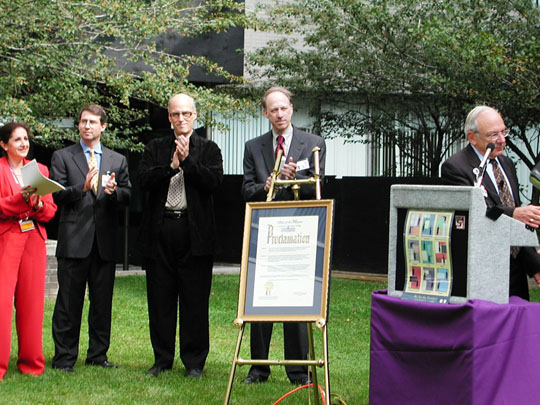 A proclamation from NYC Mayor Michael Bloomberg makes September 27th "Service Standards Day". From left: Mona Sonnenshein, Senior Vice President for hospital operations and Co-Chair of Service Standards oversight committee; Bernard A. Birnbaum, MD, Radiology, Vice Chairman clinical affairs & operations, & Co-Chair Service Standards oversight committee; Craig Brown Artist and Sculptor. Eric C Rackow, MD, President of NYU Hospital Center; Robert M Glickman, MD, Chief Executive Officer of NYU Hospital Center & Dean of NYU School of Medicine