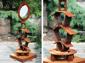 | Moon Beams The polished "Moon" rotates on its axle with the breeze or a gentle push. One side is swirled to resemble the surface of the moon as viewed through a telescope. The reverse is polished to create an image of the moon seen with the naked eye. The base is an eclectic combination of various elements welded together with an Asian infuence. "Moon Beams" is an original and very unique sculpture. "Moon Beams" has an aura that makes it difficult for the viewer to look away.... You are drawn in and find yourself relaxed and at the same time stimulated. Please contact us for an appointment to experience "Moon Beams" in our studio. Copyright 2004 Craig Brown |