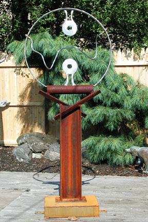 | Yin Yang 3 After creating Yin Yang 1 & 2 in traditional style, It was time to experiment with abstraction. Rules were broken, an unusual and captivating sculpture was born. The solid stainless steel bar that divides the circle has been attached in a fashion that allows kinetic movement. Rain water flows down both sides of the steel angles which reinforce the ancient philosophy of Yin Yang. The natural rust patina will change over the years, just like in Yin Yang, nothing stays the same..... Copyright 2003 Craig Brown SOLD |
